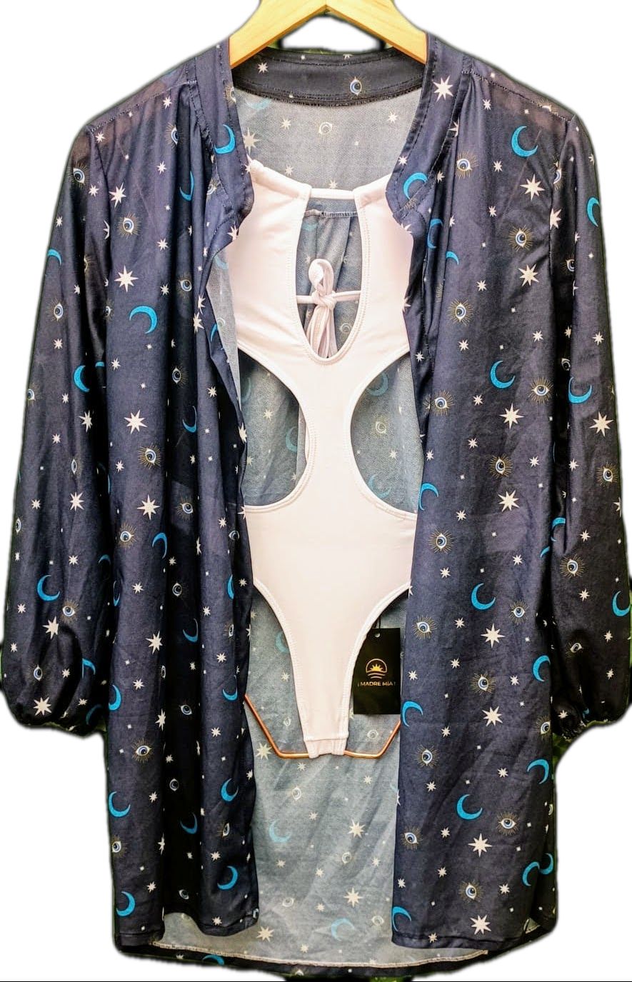 Saída de Praia: Saída curta tipo chemise sem botão, modelagem super moderna. Saída com mangas compridas, e bem fresquinha, produzida com tecido leve e delicado dando um ar chique ao look, perfeito para utilizar em eventos de praia/piscina.